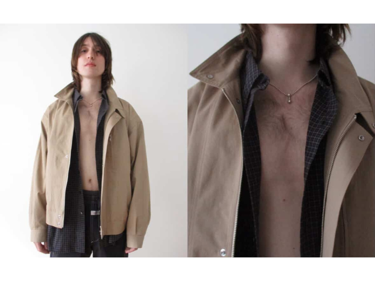 街のスナップを着想源にするデザイナーは珍しくない。だからこそ、引かれている対象に「クリーンマン」と名付けることで自分だけが見ているものの輪郭をはっきりさせた。「自分以外の人が見れば、ただのおじさんが写っているように見えると思う」と笑う。松井独自のイメージから生まれたのが「クリーンマンジャケット」だ。おじさんが着ていそうなブルゾンをイメージしながら、ファスナーの使い方など細部に上品さを加えた。