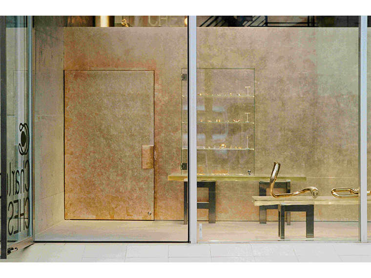 3層構造のストアデザインは、パリにある2店と同じくオランダの建築家アンネ・ホルトロップが手掛けた。ミニマルな白い空間に、ジュエリーが並ぶ分厚いガラステーブルが配されている。鈍い光を放つ、銀箔(ぎんぱく)を貼った壁が特徴的。「一日のうちでも光の入り方によって見え方が変わり、年単位でみれば酸化により銀の色自体も変化していく。日本では四季の移ろいが大切にされているが、そういった変化を感じられる店にしたいと思った」