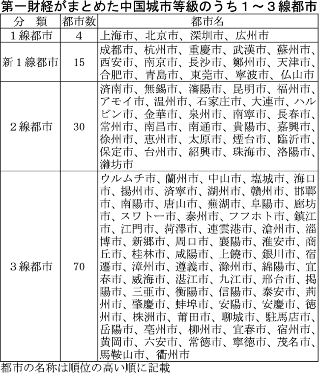 中国の都市に1線都市、2線都市あるいは1級都市、2級都市などの区分けがある。これは都市の発展度合いに応じて付いた呼称だ。1線都市は中国を代表する経済都市で直轄都市の北京、上海、改革開放で発展した広州、深圳を指す。