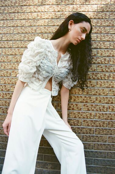 花柄のジャカードを使い、身頃はすっきり、袖にはボリュームのあるパフスリーブに仕上げたシャーリングトップ(2万2000円)もある。フロントはホックにし、トップとしても羽織り物としても使える。そのほか、スラックスも企画した。