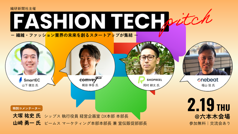 繊研新聞社では、繊維・ファッション業界に特化した、初のピッチイベントを開催いたします 。本イベントはITシステム・サービスを有するベンチャー企業と、事業変革を模索する事業会社との「橋渡し」の場を目指します。また、ゲストコメンテーターとして、シップスとビームスのデジタル・DX担当者もご登壇。未来のビジネスヒントを提供します。