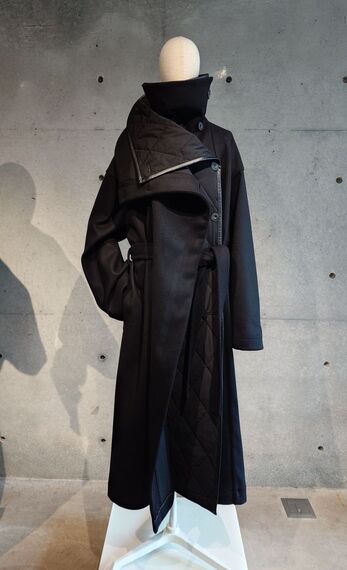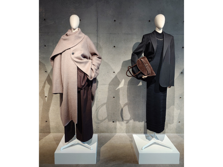 大きく立ち上がったスタンドカラーのコートは、前身頃にキルティング生地を挟んだ2重仕立てになって、静かに力強い。「柱のような縦のシルエットに着目しながら、構築性や柔らかに落ちる線を表現した」と村田。ノーカラーのテーラードジャケットは、肩にジャストフィットさせて緊張感を持たせ、前身頃の裾に量感を出して豊かなドレープラインを強調する。しっかりと作る硬質な一面と、布の質感を生かす柔らかなシルエットとのコントラストによって、マスキュリンな魅力の女性像を描く。