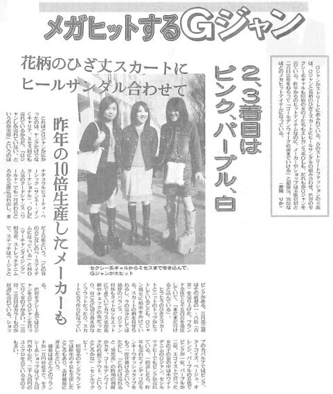 Gジャンがストリートにあふれている。春のストリートファッションの主流は、Gジャンと花柄の膝丈スカートにヒールサンダルの組み合わせ。渋谷のセクシー系ギャルも原宿の女の子たちもエレガンス系OLも、誰もがGジャンを着ている。昨年からのヒットアイテムなのに、メーカーやショップは未購買層と2着目需要を狙って「ゴールデンウィーク直前までいける」と超強気。異常なほどのメガヒットアイテムになっている。