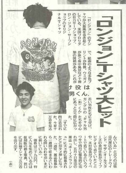「ロンジョン」のTシャツが大旋風を巻き起こしている。米国フロリダの有力サーフショップ、ロン・ジョン・サーフショップのオリジナルTシャツで、絵画のような多色プリントが特徴。ウミガメが泳ぐ海中風景など10種類の図柄がある。これが若い男性たちに大受け。ガングロのギャル男くんたちを中心にあっと言う間に広がった。