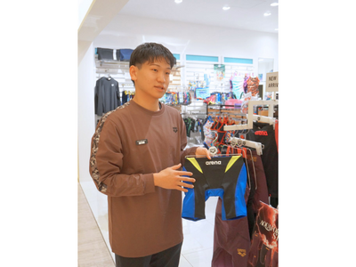 グランフロント大阪南館4階にあるスイムブランド「アリーナ」ショップ(デサントジャパン運営)で、今年4月から販売職正社員として働く池田拓親さん。就学前から水泳教室に通い、中・高では部活に打ち込み、大学時代は2年間、スクールでコーチを務めた経験がある。初心者・競技者・保護者の気持ちをよく知っているからこそ、当事者に寄り添った接客ができるのが強みだ。