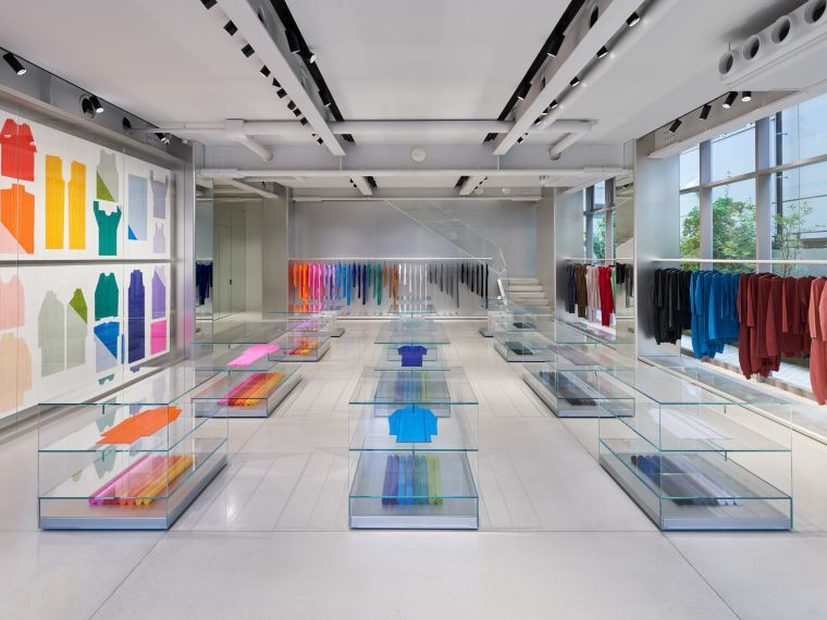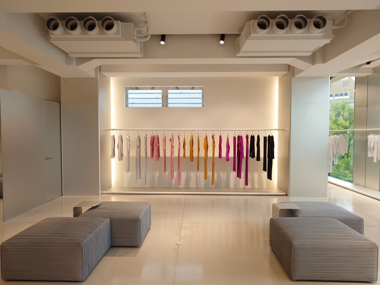 店舗デザインは、ブランドのロゴをはじめ、主要都市の旗艦店を手掛けた吉岡徳仁氏によるもの。一部にアルミニウムの壁面を取り入れ、ガラス張りのウィンドー、ガラス板の什器を導入し、透明感のあるインダストリアルな雰囲気だ。それぞれのフロア面積は160平方メートル強。1階の壁面には「製品プリーツ」(縫製した後に紙に挟んでプリーツをかける手法)の工程を展示し、コアとなるもの作りを可視化した。製品は線の細いハンガーラックとガラスの棚に陳列し、存在を浮き立たせた。
