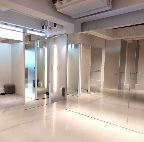 2階と3階には、プリーツをかけた「ウルトラスエード」のソファを設置。試着室のある3階は、壁面を鏡で設え、錯覚しそうなユニークなフロアとなっている。