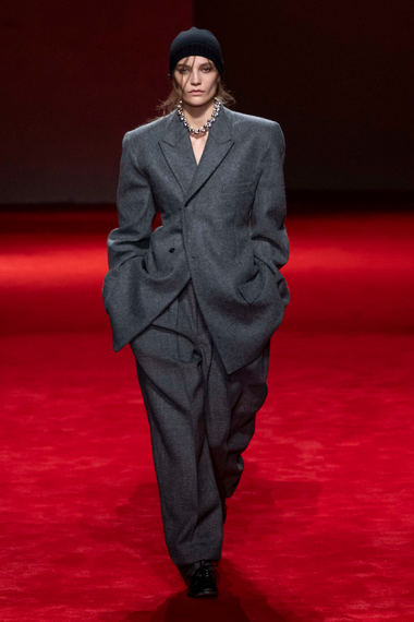 ボッテガ・ヴェネタはルイーズ・トロッターによるセカンドシーズンとなる。先シーズンは、マチュー・ブレイジーの路線を無難に引き継いだ印象だったのだが、秋冬はよりトロッターらしさを出したように思う。大きなショルダーの迫力のあるテーラードスーツ、ボリューム感あるテーラードコート。アシンメトリーに襟がはみ出たシャツのディテールがアクセントとなる。