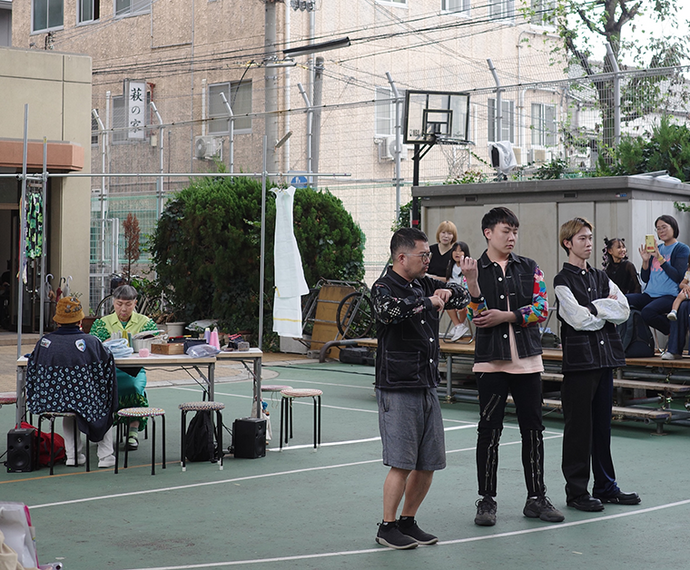 今回のショーは、ブランドが大阪・関西万博と連動した大阪関西国際芸術祭に参加したのを機に企画した。会場は山王集会所。ステージの中心に裁縫道具を並べた作業台を設け、ウォーキングを終えたモデルが次々に作業台に集い、話しながら裁縫をするという日常の製作風景を再現した。