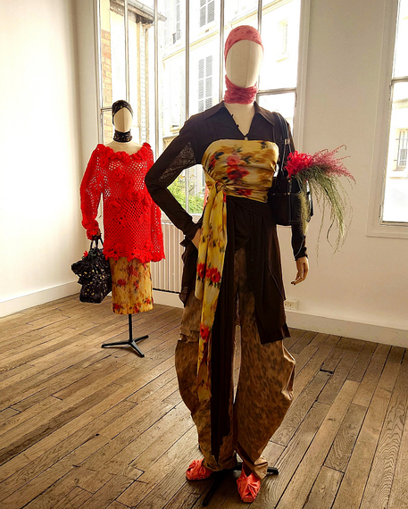 布を結ぶ、ねじるといった身近な手段を生かしながら、テーラードジャケットやロングシャツを思いのままにレイヤード。ランダムプリーツのシフォン、絣風の花柄など色鮮やかなテキスタイルを掛け合わせ、ノスタルジックに見せた。軽くてもこもこした糸を使ったクロシェの花柄セーターを素肌に着たルックもある。
