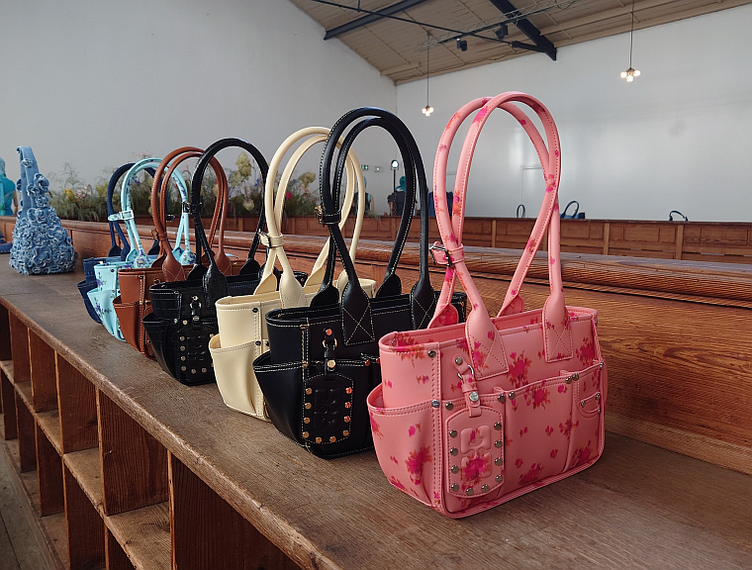 新作のバッグは、ガーデニングバッグをアレンジした「ポージーバッグ」。ファスナーで開閉するふたが付いて、周囲はポケットで覆われる。実用的でキュートなバランスが目を引いた。