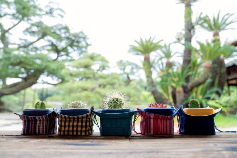 「碧のおくるみ」(H-01)は香川の伝統工芸「保多織」の織物にサボテンを組み合わせた工芸と植物のプロダクツブランドだ。「伝統を暮らしのそばに」がコンセプトで、通気性、吸水性、保温性のある保多織で鉢を包む。保多織は5色のリバーシブル展開。サボテンとのセット以外も提案している。