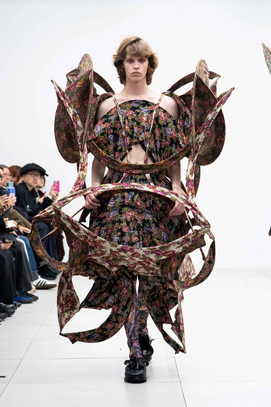 リュウノスケオカザキは(岡﨑龍之祐)は、4年ぶりにファッションショー形式で新作を披露した。それはボーンを生かした立体的な造形ドレス。ストレッチ性のある素材にボーンの枠組みを入れて立体のフォルムを作り出す。造形は羽を揺らすチョウのようでもあり、ロールシャッハの図版のようでもある。
