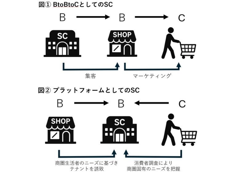 当時、SCビジネスは「BtoBtoC」とされ、ディベロッパーの役割は集客、テナントの役割はマーケティングであった。ディベロッパーは、中心市街地や駅などの流動が多い立地にSCを、郊外に大規模なモールを建設して集客を図った。テナントは「入館者数が多いSCは売り上げが見込める良いSC」と判断し出店、マーケティングを担った。