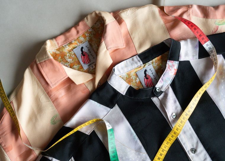 同ブランドが打ち出すシャツは、すべて譲渡会で無料で譲り受けたきものを活用している。きものをほどいて、裁断し、だいたい3枚前後の生地を組み合わせて同じデザインのないシャツに仕立て上げる。