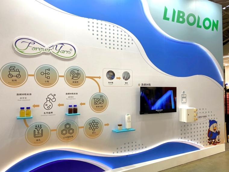 台湾企業は、繊維to繊維リサイクルへの関心を高めている。廃材を繊維に再生しやすくしようと、モノマテリアル(単一素材)での開発が活発。回収原料は廃棄ペットボトルに代わって廃漁網や古着が主流になりそうだ。産業資材やバイオ原料を再利用した素材の提案も散見された。