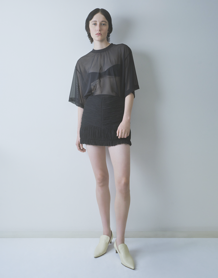 「コート」(福屋千春)は、透け感や繊細な質感のテキスタイルを生かし、素の美しさを感じさせる日常着を揃えた。目を引くのは、ボディーを柔らかなテクスチャーで覆うコンパクトスリーブのトップとミニスカート。シフォンをプリーツ加工で凝縮し、パーツごとに縫い留めながら構築的に見せた。ミニマルなシルエットとともに優しい表情が漂う。ミニスカートには、滑らかなメッシュのクルーネックTシャツを合わせ、ストリートの抜け感を添える。メッシュのノースリーブトップにリバーレースを切り替えたロングドレスもある。リバーレースを肩に掛けるとバルーンシルエットのマントになる。