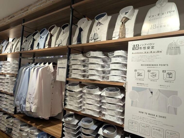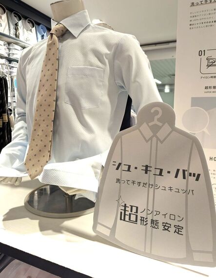 しわになりにくい縫い方にもこだわる。綿100%のシャツは本縫いが一般的とされるが、同社の商品はロック縫いを採用。「縫製箇所が波打ちにくく、しわが出にくいことがわかった」からだ。CVCのシャツが税込み5489円、綿100%のシャツが6589円。3月に発売後、「来店客の選択肢がシュ・キュ・パッに絞られる」とし、売れ行きは好調という。