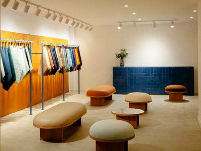 ショールームの空間デザインはルイ・ペレーラとリョウスケ・フクサダのデュオが担当。両氏がデザインを手掛けたデンマークの家具ブランドによるウルトラスエードのソファ「ANZA」も置く。