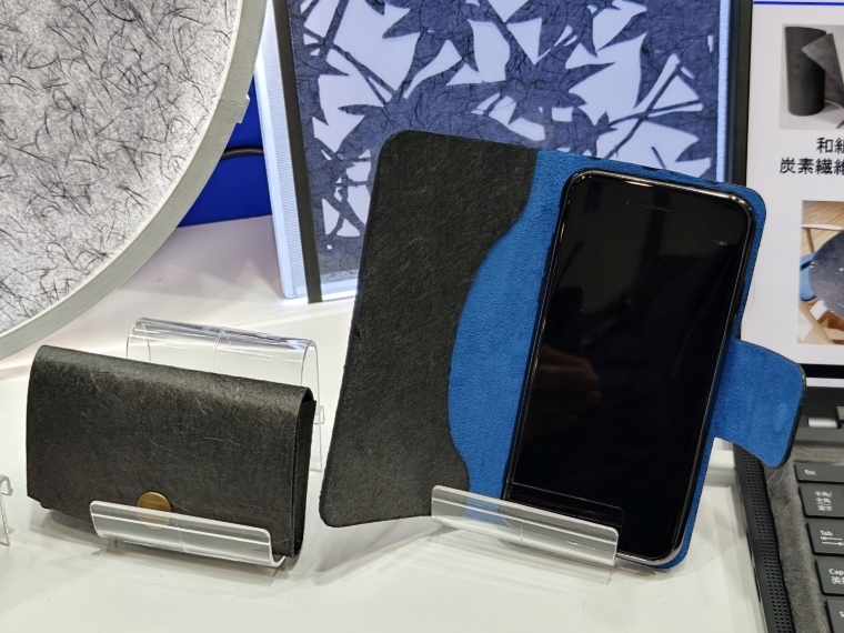 炭素繊維では、東レが開発したリサイクル技術を使った和紙調の意匠素材を開発した。複合材の熱硬化性樹脂を新規分解剤で低温で溶かし、リサイクル炭素繊維を取り出す。これを活用し、湿式不織布に混ぜて和紙調の見た目、風合い、凹凸感を表現した。照明・インテリア部材などを想定、試作品として人工皮革「ウルトラスエード」と貼り合わせたスマートフォンケース、名刺入れも展示した。