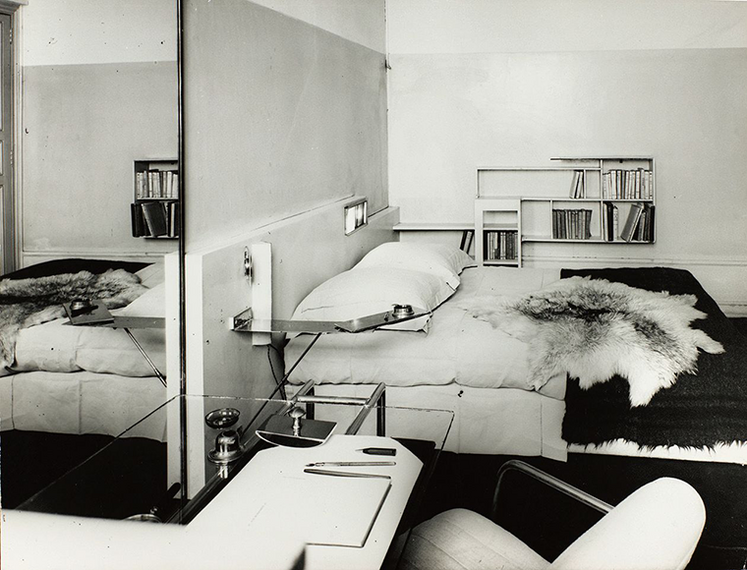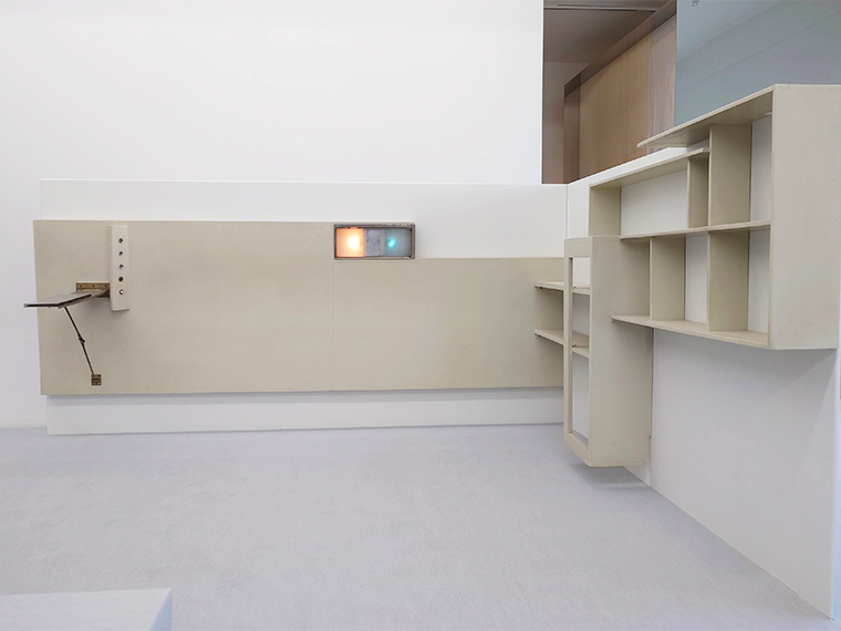 入り口を入ると、柔らかな色味で端正に組まれた直線のフレームが現れる。グレイ氏がパリのボナパルト通り21番地にあった、自身のアパルトマンのためにデザインしたベッドフレームと書棚の家具作品だ。読書のためのオレンジのライトと就寝時のブルーのライトがほっとした気持ちを誘う。「ミニマルな設計に機能美が備わって、そこでどう過ごしていたか、暮らしが見える。彼女の建築を見ていると、自分の服作りもそうでありたいって思うんです」と佐原は話す。とりわけ今回のベットフレームは、色味や全体のバランスもブランドが目指す方向に一致し、「自分の店ができそうと思えた」という。