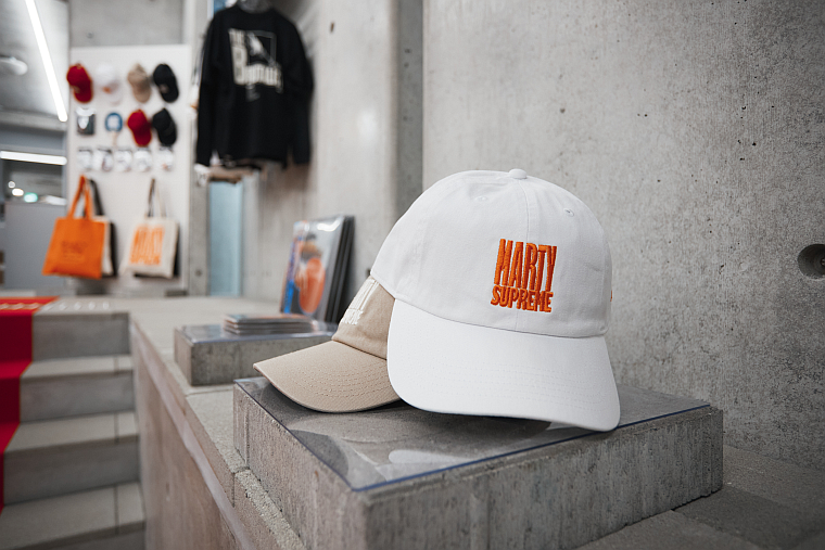 店内にもレッドカーペットを敷き、ビジュアルで演出し、2階の関連商品がある売り場へと誘導。マーティ・シュプリームのロゴを大胆にのせたものなどTシャツ複数(税込み9900円)をはじめ、ナイロンやニットのバッグ、キーチャーム、キャップ、ピンズセット、ウールモヘヤのスラックス、別注眼鏡などの協業品がある。ニューヨークを拠点とする映画スタジオ、A24の公式グッズもセレクトして販売している。