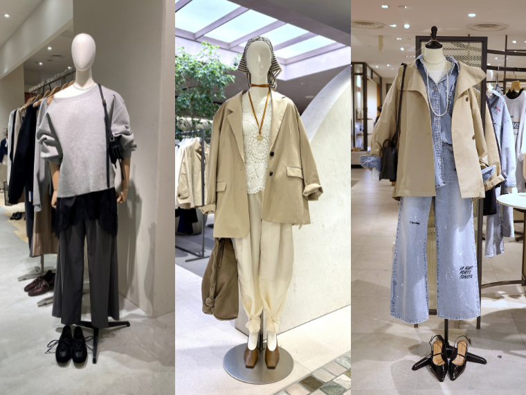 春夏のテーマは、カジュアルやリラックスしたムードがキーになりそうだ。2月はそのエッセンスを見せつつも、実気温に配慮した定番品が軸となる。今の時期から春まで着られるコートやセーター、シャツ、ブラウスなどだ。白からベージュの爽やかな色をトルソーに着せ付けて、季節感も出しながら堅実に売っていく。今が売り時のセレモニーやオケージョンアイテムもプッシュする。(価格は税込み)