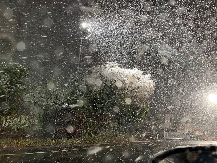 曇り空からみぞれが降り出し、新座市のあたりで雪が本格的に降り出した。雪国のようにふぶいている。枯れ木が雪をまとって花が咲いたようになっていた。道は渋滞し、なかなか先へ進めない。