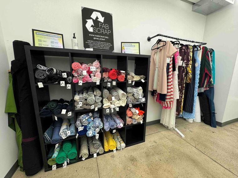 アップサイクルに使えそうなデッドストック生地やサンプル、リバティーなどの生地ブランドの新品の生地を買える部屋もある。