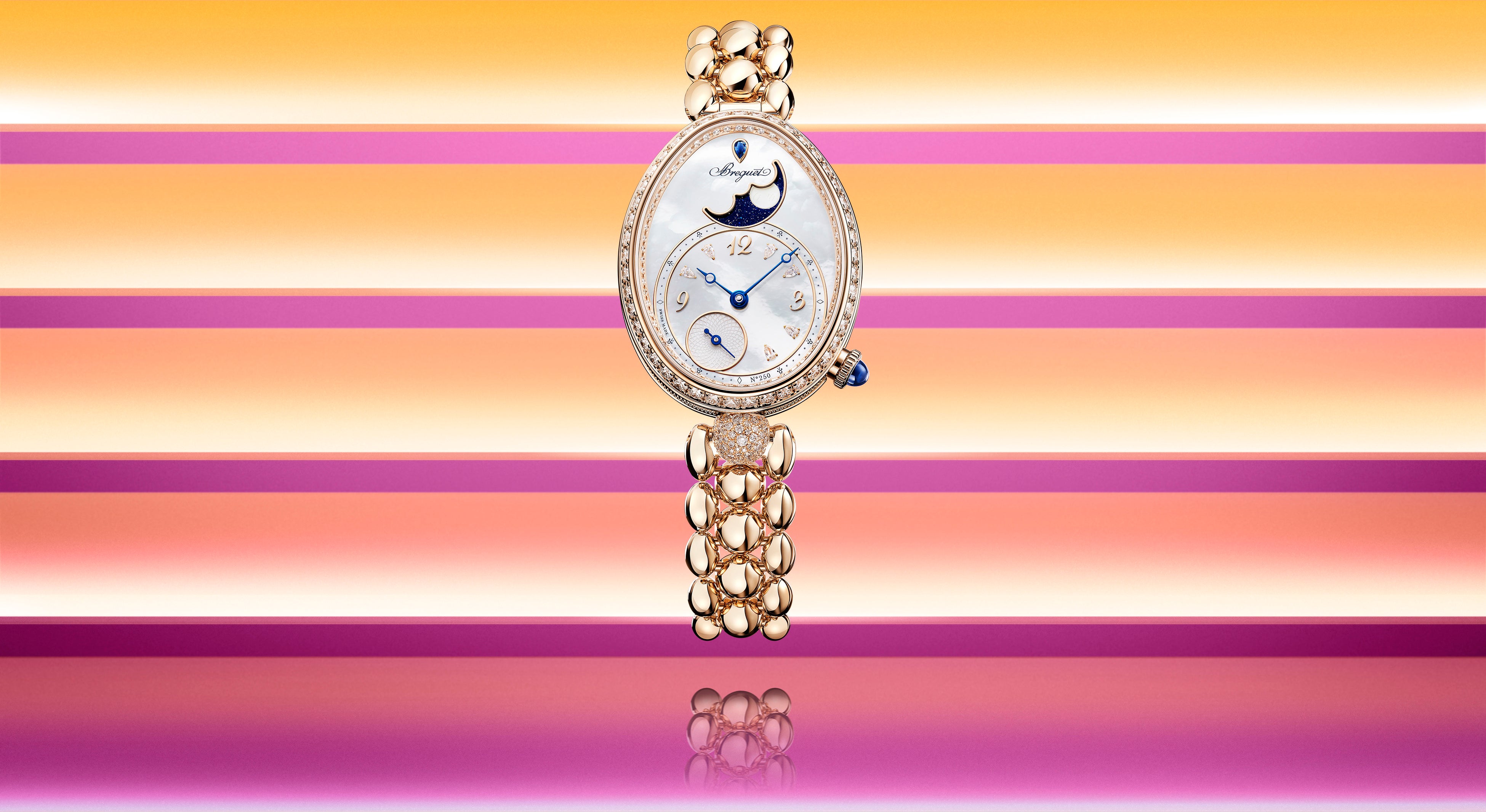 ブレゲ・マニュファクチュールは、250周年を記念して、「レーヌ・ドゥ・ナープル」にRef.9935とRef.8925の新しいモデルを加え、コレクションを充実させました。Ref.9935の特徴は、新型ムーブメントや今までにない表示スタイル、新しさを引き立てる数々の美しいデザインです。Ref.8925のほうは、新しいフェイスデザインとオールゴールドのブレスレットです。いずれもブレゲゴールドが初めて採用されています。ジュエリーのようにデザインされたバリエーション豊かなこのモデルは、一日のあらゆる時間、どんなシーンにも寄り添う理想的なパートナーです。