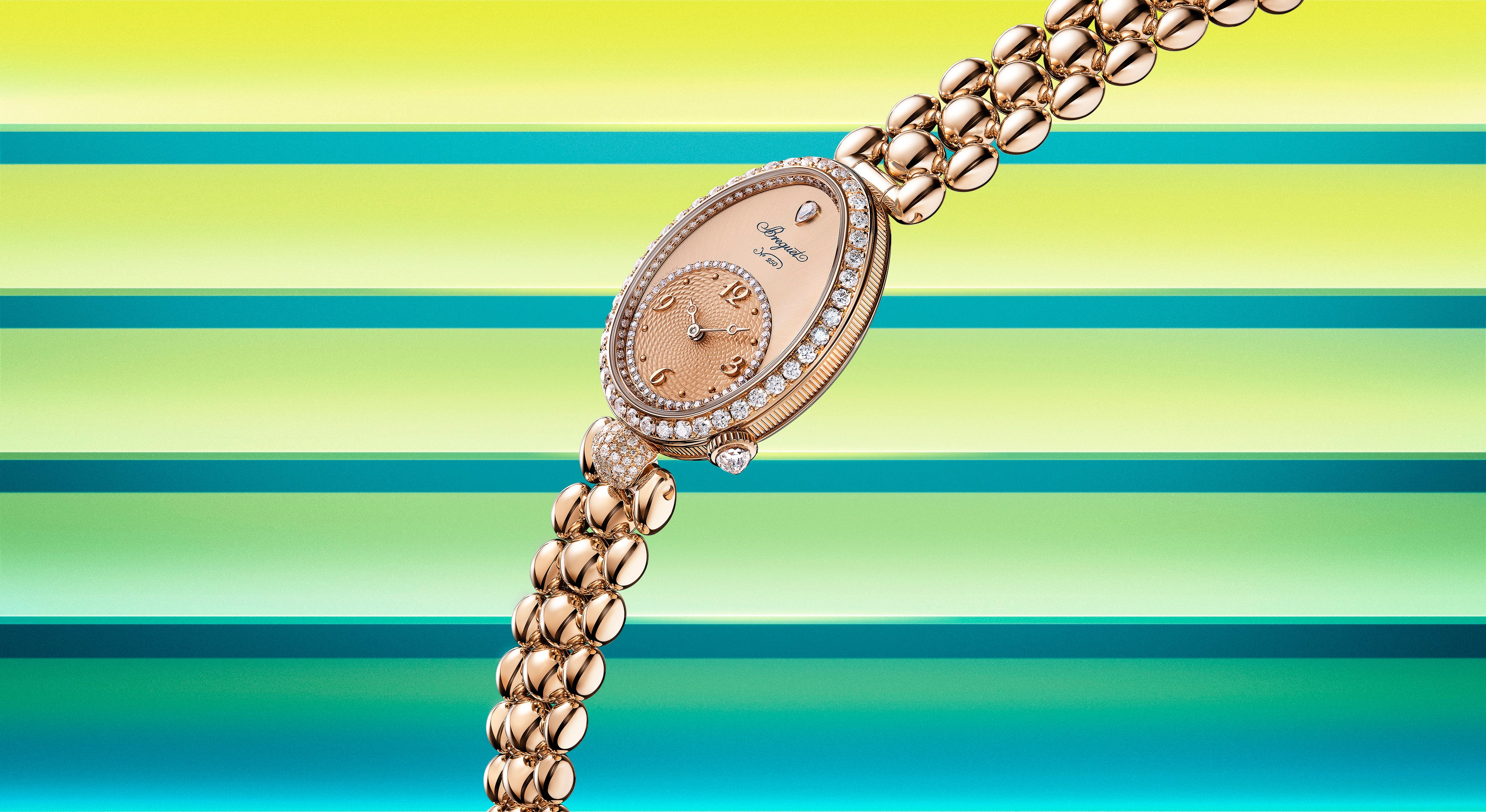 ブレゲゴールドを初めて用いた「レーヌ・ドゥ・ナープル 9935」のケースは、センターラグが備わり、6時位置のこの丸いラグにダイヤモンドがスノーセッティングされています。新しいブレスレットのリンクは、このラグのフォルムから想を得てデザインされました。