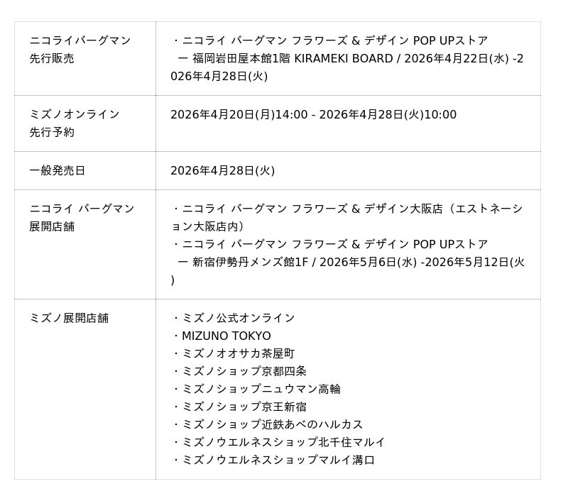 フラワーアーティスト ニコライ・バーグマンが率いるフラワーデザインブランド Nicolai Bergmann Flowers & Design (以下 ニコライ バーグマン) と、今年創業120周年を迎える総合スポーツ用品メーカー Mizuno (以下 ミズノ) の初コラボレーションアパレルが、2026年4月28日火曜日より限定店舗及びオンラインショップにて発売されます。