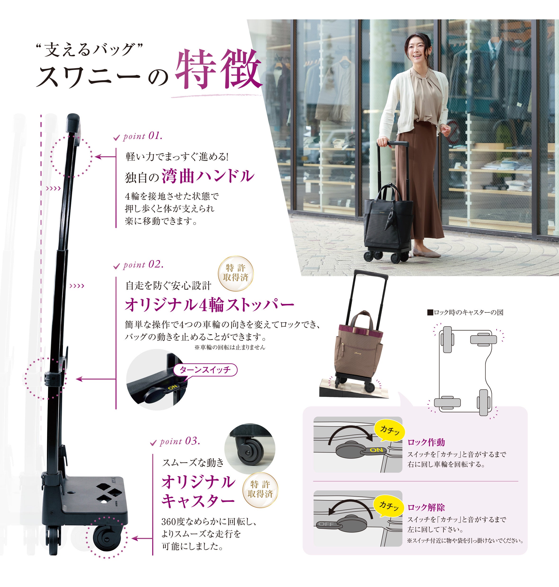 SWANYのカートバッグは、歩行や移動をサポートする独自の「湾曲ハンドル」をすべてのモデルに採用。「重たい荷物を軽く運べる」という機能性が、仕事や買い物、旅行、習い事など、日常のさまざまなシーンで支持され、幅広い年齢層のお客様にご愛用いただいています。