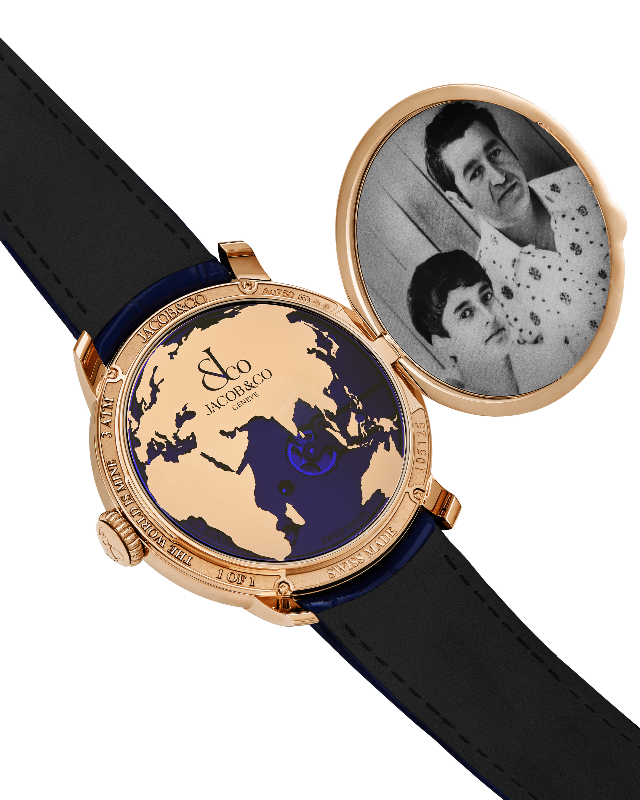ロケットスタイルのケースバックにはジェイコブアラボと、その父ニソン・アラボの在りし日の写真が納められる