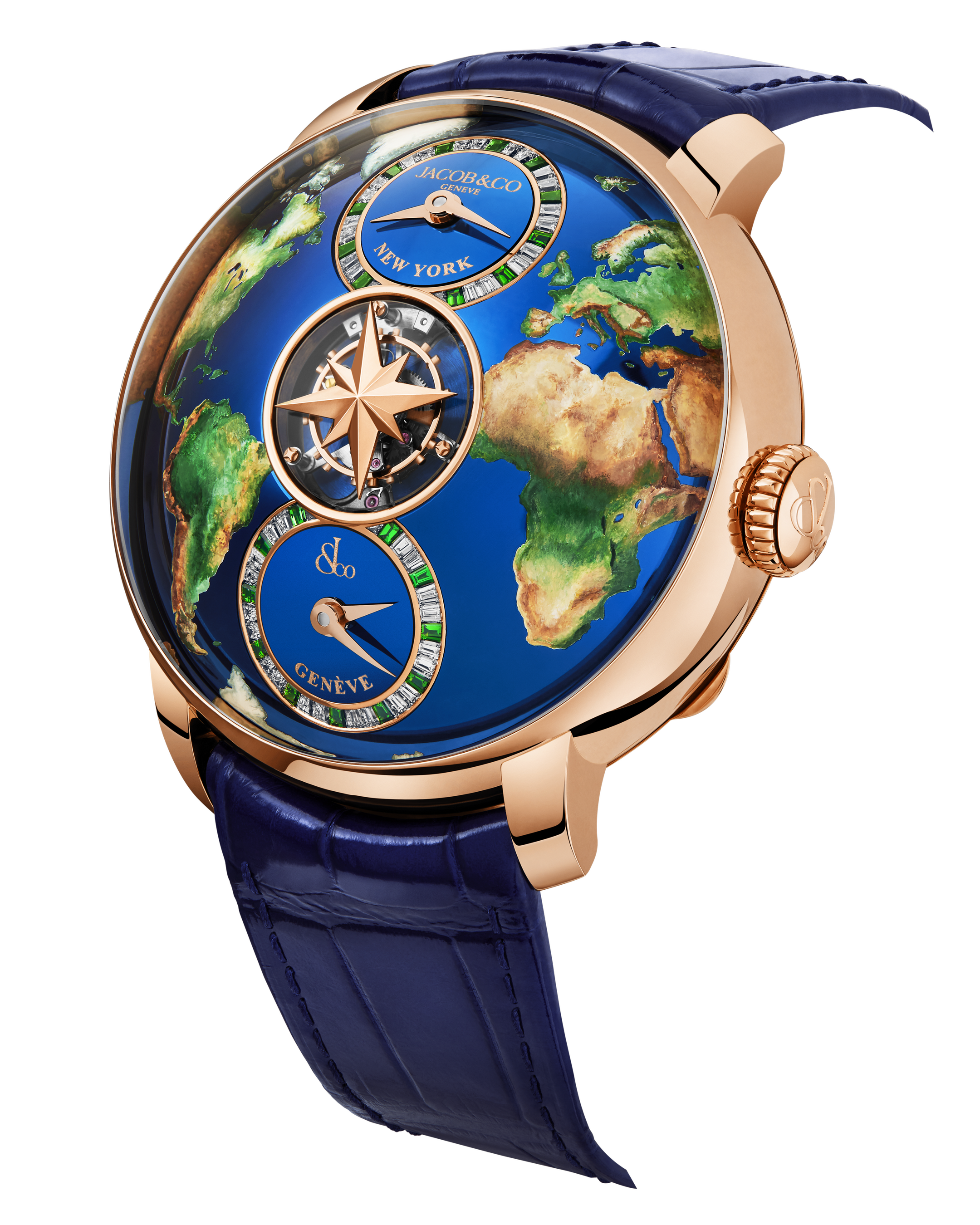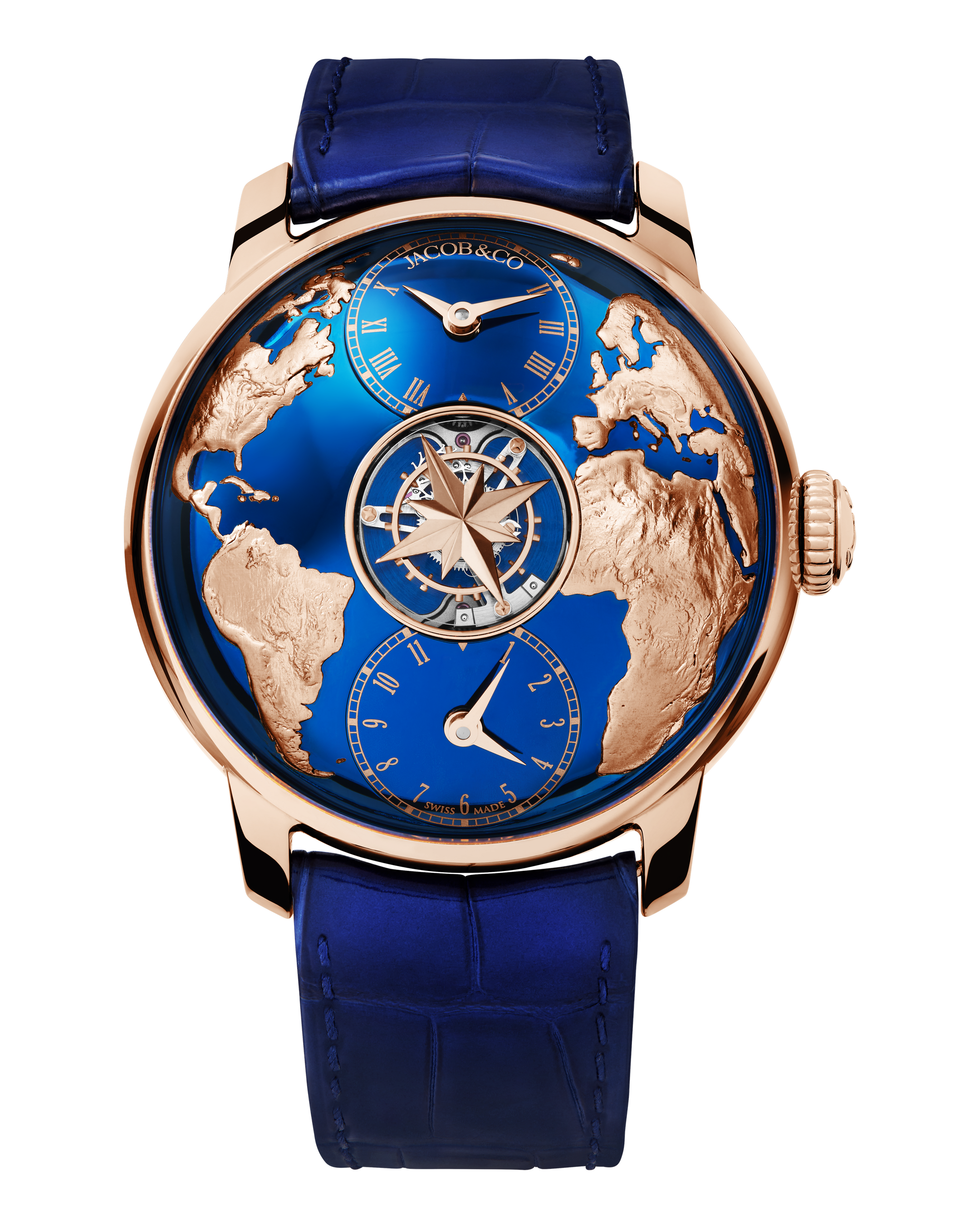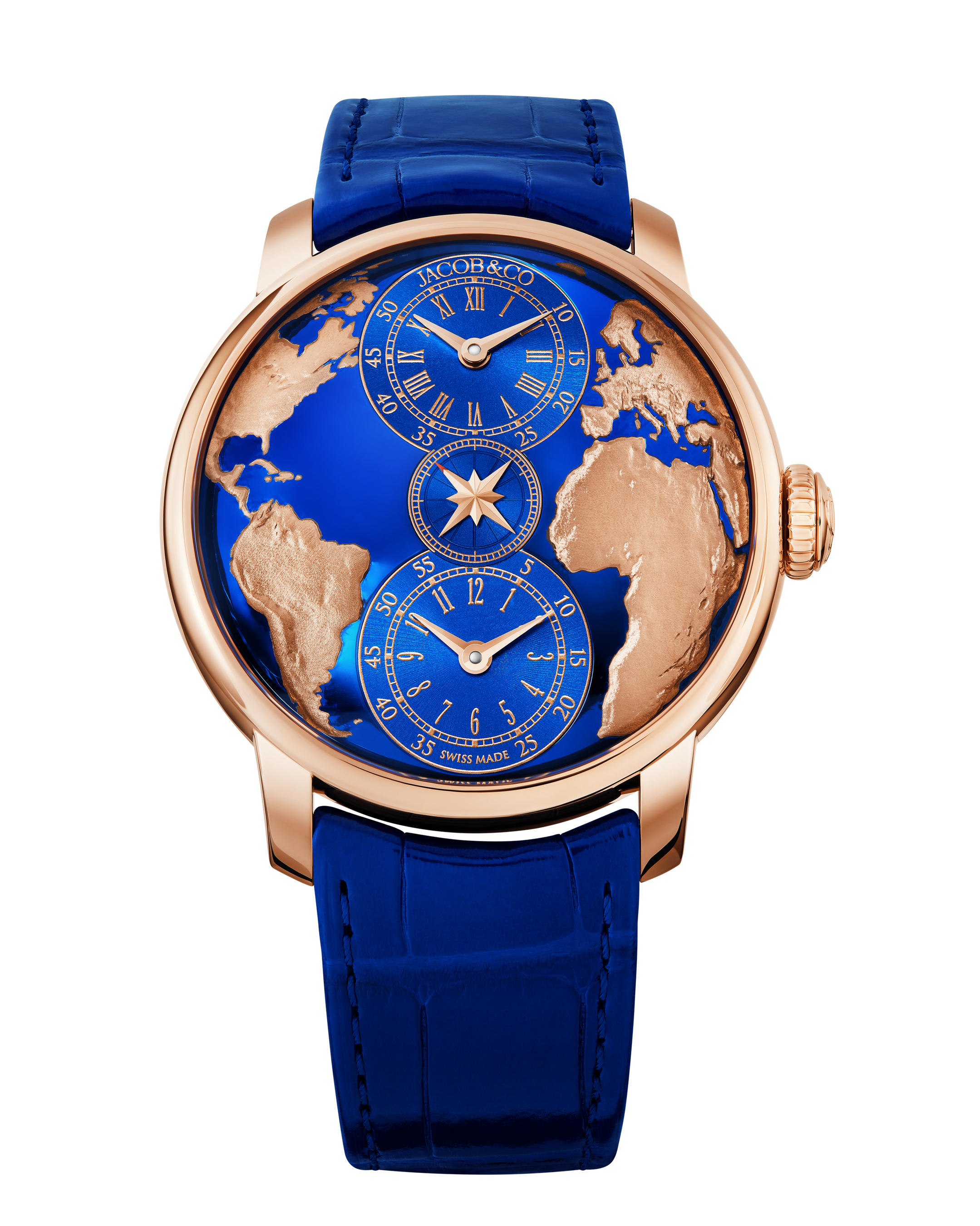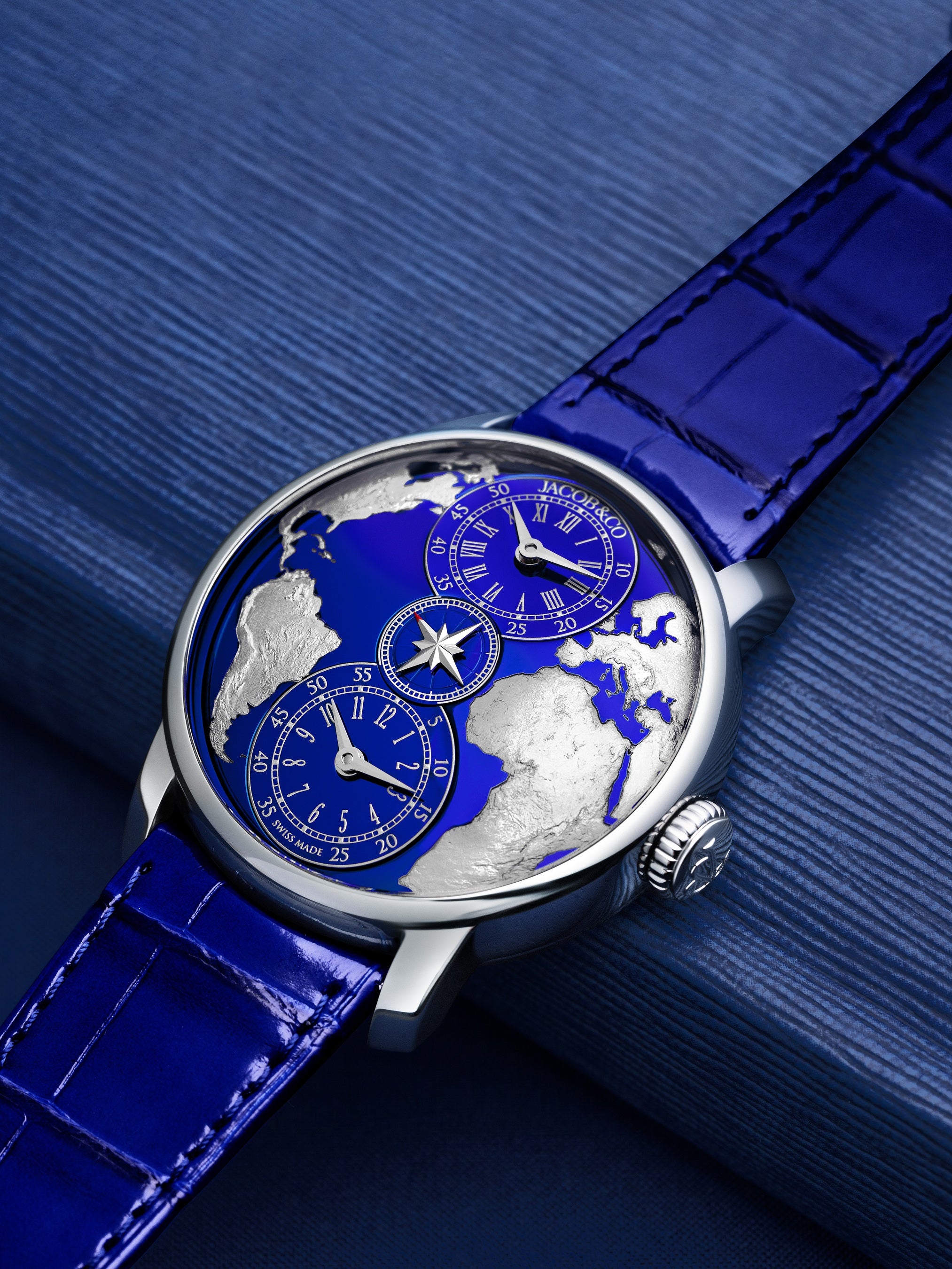世界地図を描いた立体的なダイヤルは、海と大地のコントラストが息をのむほどに美しく、ジェイコブ&コーらしい“感情を呼び起こす時計”として高く評価されています。