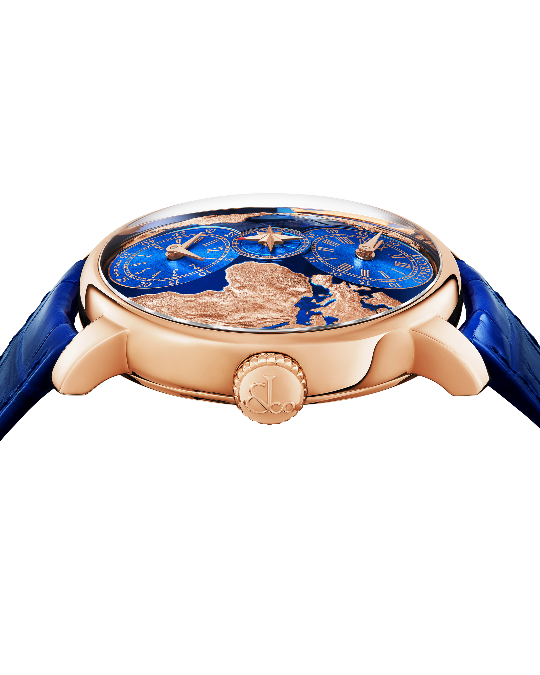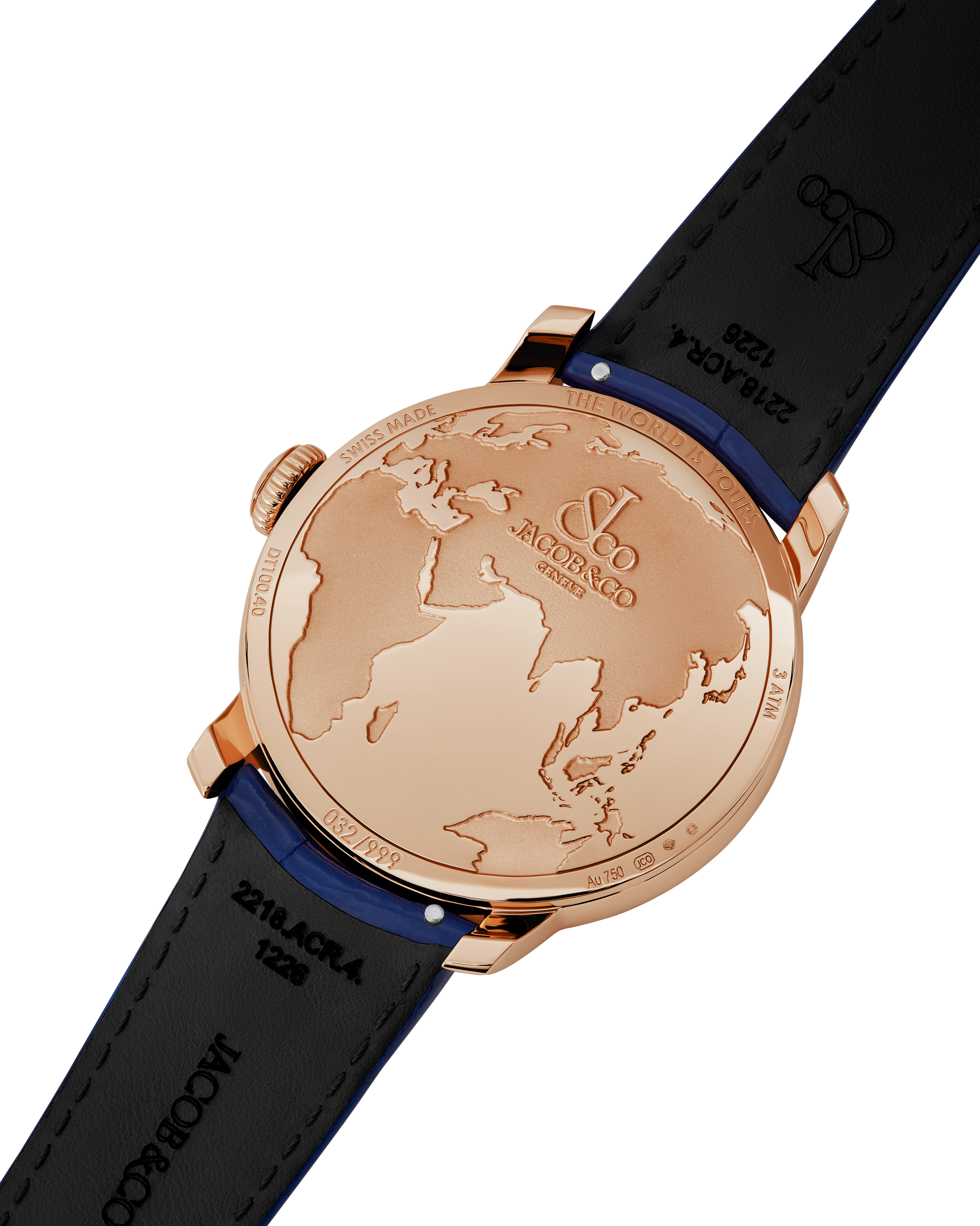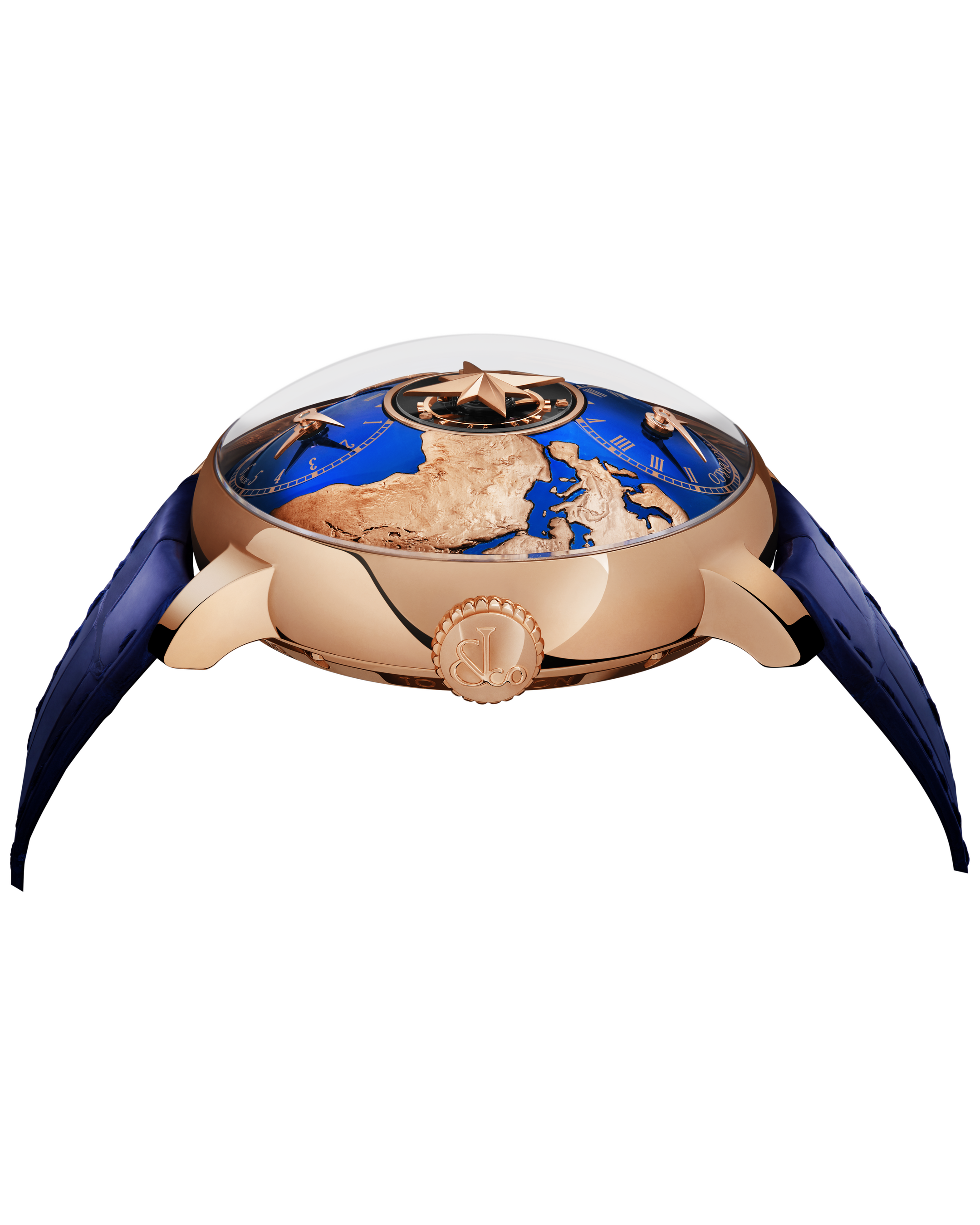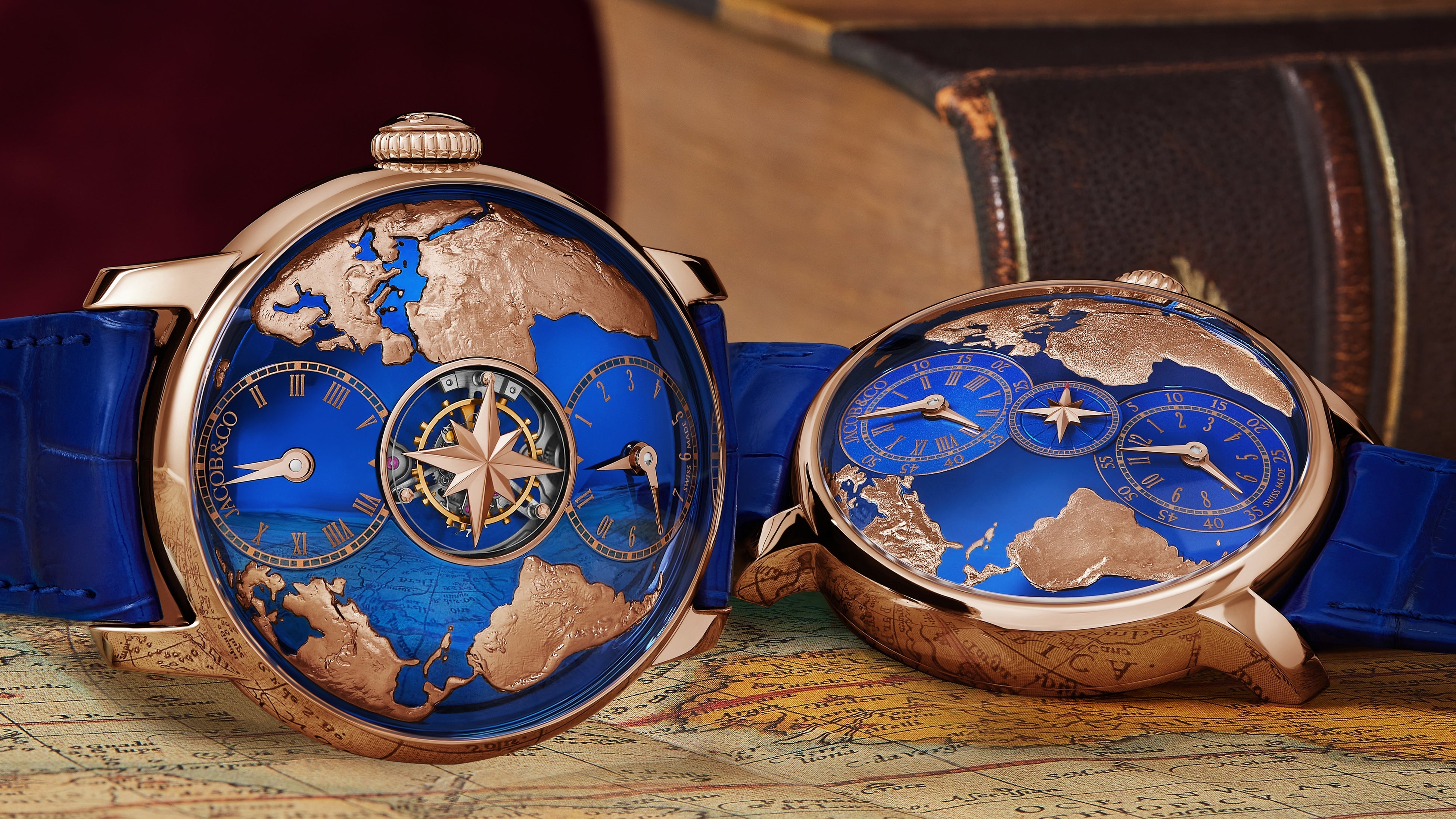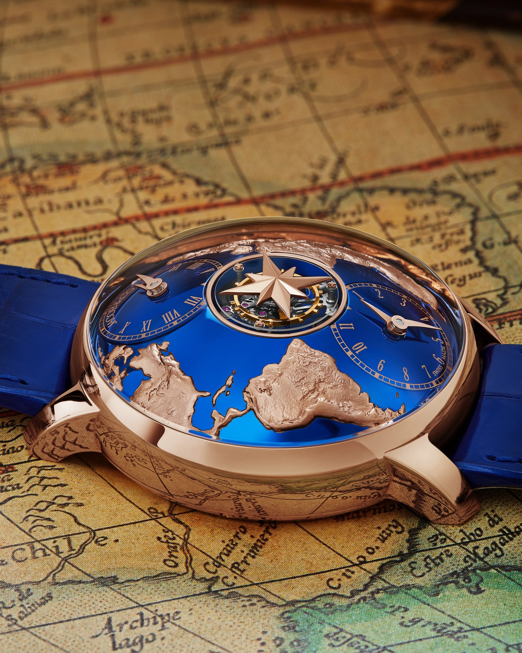 世界地図を描いた立体的なダイヤルは、海と大地のコントラストが息をのむほどに美しく、ジェイコブ&コーらしい“感情を呼び起こす時計”として高く評価されています。