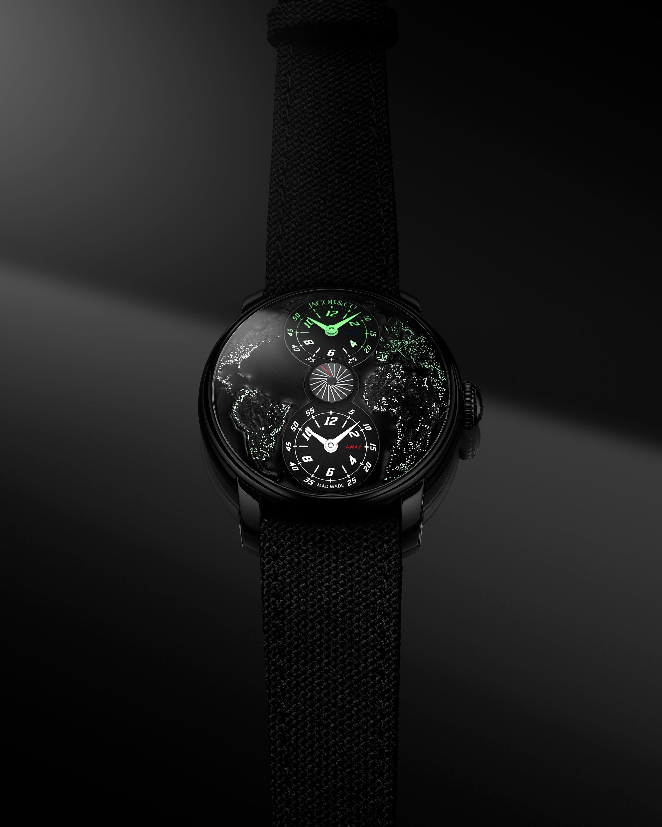 このモデルは、ブラックDLCのケースにブラックPVDで仕上げられた大陸と海を組み合わせ、マッドパリを象徴する“オールブラック”のカラーコードを纏っています。まるで夜の地球を高高度から見下ろしたかのようなこのデザインの最大の特徴は、都市の光を思わせる部分に施されたスーパールミノバ(蛍光塗料)です。暗闇の中で文字盤が静かに光を放つその姿は、まさに夜空を漂う惑星のよう。
