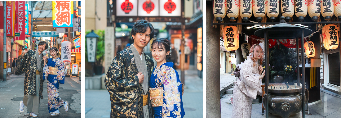 大阪らしい街並みや日本らしい雰囲気のある寺院のロケーションで特別な思い出を残すことができます。