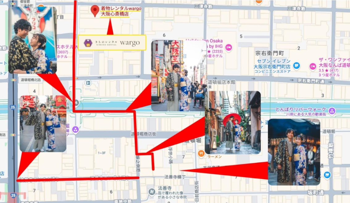 出発|きものレンタルwargo 大阪心斎橋店着物に着替えたらお店前で同行カメラマンと待ち合わせ、カメラマンが撮影スポットへご案内します。
