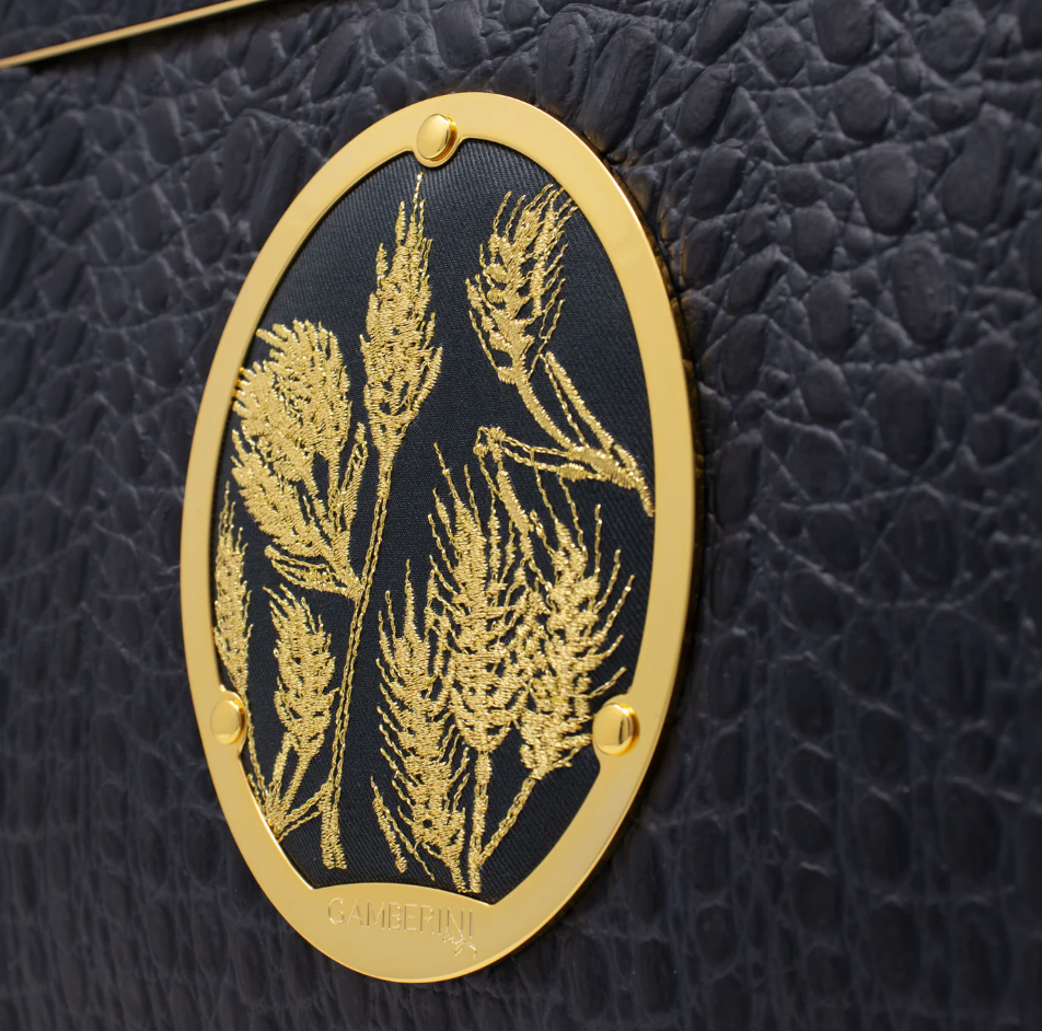 ブラックレザーのボディには、イタリア製の刺繍モチーフが絶妙に組み合わされております。繊細なブラックファブリックの上に金糸がほのかに輝くよう丁寧に仕上げられ、気品と調和の取れたコントラストを生み出しています。これは、時代を超えたエレガンスと伝統への現代的なオマージュです。