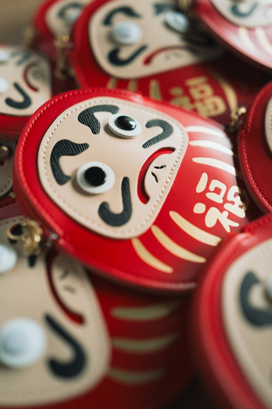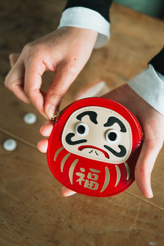 「だるまのコインケース」は手のひらに収まるコンパクトなサイズで、コインケースとしてはもちろんのこと、置物や背中についたDカンにストラップをつけてチャームとしてもお使いいただけます。目の部分はホックになっているため、白→黒に入れ替えることが可能。ぜひ願掛けをしてお使いください。