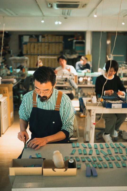 革小物メーカーとしては国内最大級のサンプル室を有し、OEM生産のプロフェッショナルとして、年間数万個の革小物を製造。特に取得が難しいとされる「小物技術認定(皮革部門)」試験の一級を持つ20~70代の幅広い年代の職人が在籍しています。