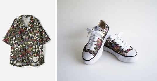 Maison MIHARA YASUHIRO定番の開襟シャツや、ブランドを代表するスニーカーモデル” PETERSON”など、メゾンの人気アイテムに、2015AW「Parfum de nuit」コレクションのテキスタイル ”チャイニーズサーカス”を使用した華やかなコラボレーションのコレクションです。「三原康裕さん(やっちん)とは、僕がブランドをデビューさせてすぐ、まだ彼が学生で独学で靴をつくっていた頃からの友人で、テキスタイル科だった彼の卒業製作を、ケイタマルヤマのアトリエで手伝ったことから始まる永きにわたる仲間です。すでに百を超える丸山百景コラボの最期を締めくくるのは、Maison MIHARAYASUHIROだと思ってお願いしました。」と丸山敬太はその想いを語ります。
