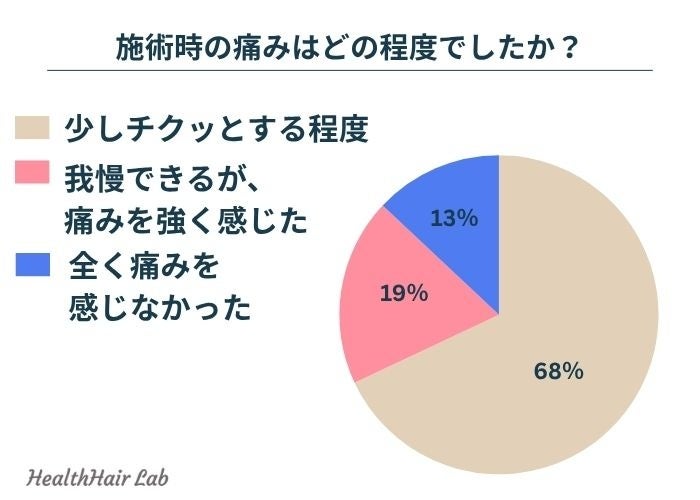 施術時の痛みについて伺ったところ、『少しチクッとする程度(68%)』『我慢できるが、痛みを強く感じた(19%)』『全く痛みを感じなかった(13%)』という回答が集まりました。