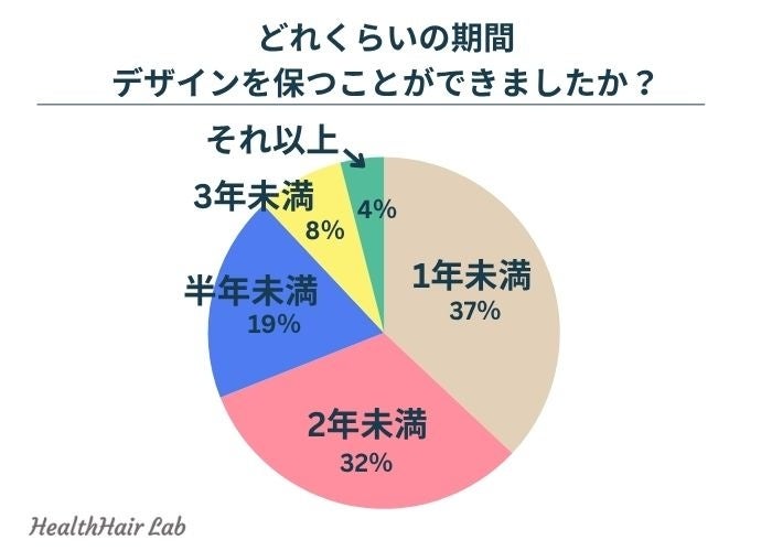 デザインを保つことができた期間について伺ったところ、『1年未満(37%)』『2年未満(32%)』『半年未満(19%)』『3年未満(8%)』『それ以上(4%)』という回答が集まりました。
