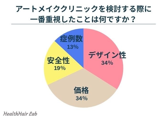 クリニックを選ぶ際に重視したことについて伺ったところ、『デザイン性(34%)』『価格(34%)』『安全性(19%)』『症例数(13%)』という回答が集まりました。