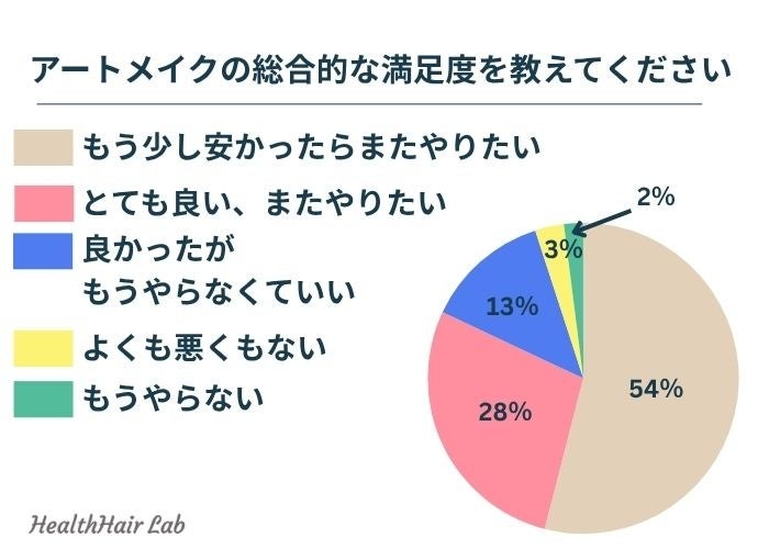 アートメイクの満足度について伺ったところ、『もう少し安かったらまたやりたい(54%)』『とても良い、またやりたい(28%)』『良かったがもうやらなくていい(13%)』『よくも悪くもない(3%)』『もうやらない(2%)』という回答が集まりました。