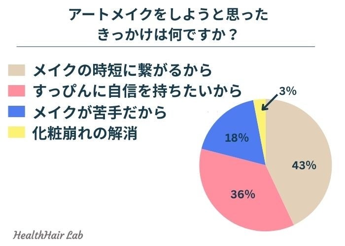 アートメイクをしようと思ったきっかけについて伺ったところ、『メイクの時短に繋がるから(43%)』『すっぴんに自信を持ちたいから(36%)』『メイクが苦手だから(18%)』『化粧崩れの解消(3%)』という回答が集まりました。