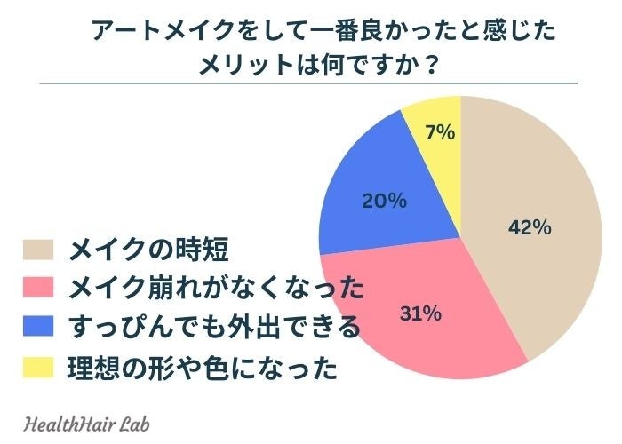 アートメイクの1番のメリットについて伺ったところ、『メイクの時短(42%)』『メイク崩れがなくなった(31%)』『すっぴんでも外出できる(20%)』『理想の形や色になった(7%)』という回答が集まりました。