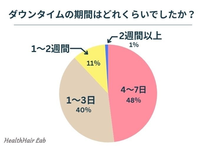 施術後のダウンタイムについて伺ったところ、『4~7日(48%)』『1~3日(40%)』『1~2週間(11%)』『2週間以上(1%)』という回答が集まりました。